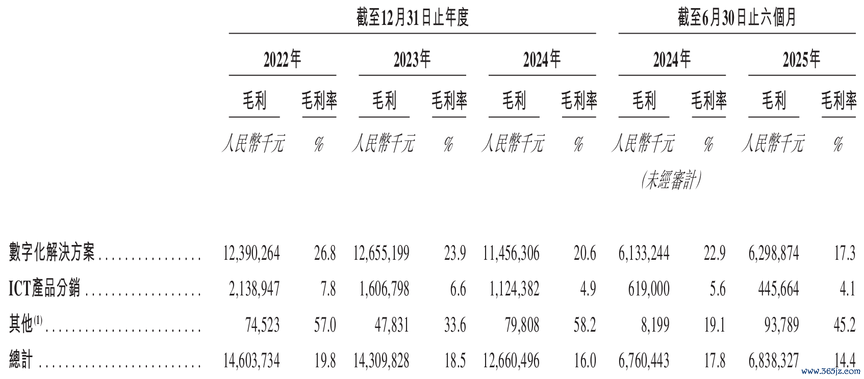 与此同期,公司毛利率的变化也反馈出这种趋势。凭证招股书,2022至2025上半年,紫光股份全业务线的毛利率均出现抓续下落,数字化处分有斟酌的毛利率失守20%,ICT产物分销业务的毛利率也跌至5%以下。公司的全体毛利率也从2022年的19.8%降至2024年的16%,2025上半年更是进一步降至14%。